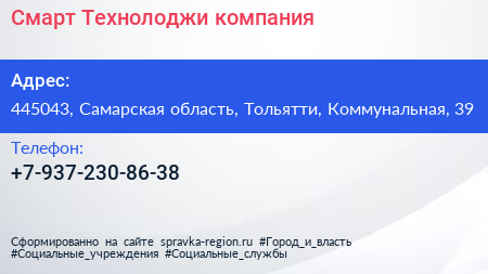 Смарт Технолоджи, компания по адресу 445043, Самарская область, Тольятти, Коммунальная, 39 в дальнейшем Организация, размещена в следующих категориях: