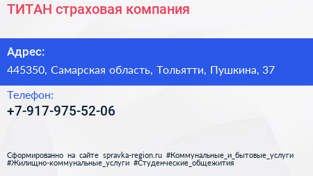 ТИТАН, страховая компания по адресу 445350, Самарская область, Тольятти, Пушкина, 37 в дальнейшем Организация, размещена в следующих категориях: