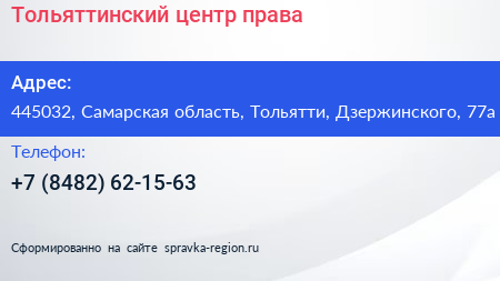 Тольяттинский центр права по адресу 445032, Самарская область, Тольятти, Дзержинского, 77а в дальнейшем Организация, размещена в следующих категориях: