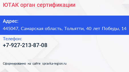 ЮТАК, орган сертификации по адресу 445047, Самарская область, Тольятти, 40 лет Победы, 14 в дальнейшем Организация, размещена в следующих категориях: