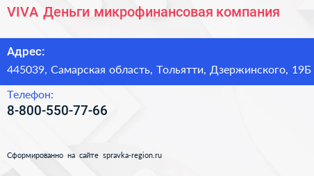 VIVA Деньги, микрофинансовая компания по адресу 445039, Самарская область, Тольятти, Дзержинского, 19Б в дальнейшем Организация, размещена в следующих категориях: