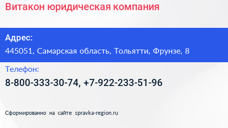 Витакон, юридическая компания по адресу 445051, Самарская область, Тольятти, Фрунзе, 8 в дальнейшем Организация, размещена в следующих категориях: