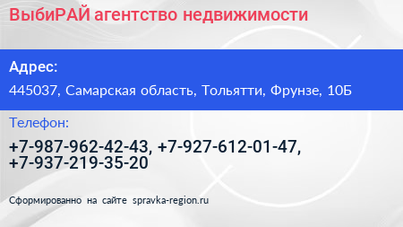 ВыбиРАЙ, агентство недвижимости по адресу 445037, Самарская область, Тольятти, Фрунзе, 10Б в дальнейшем Организация, размещена в следующих категориях: