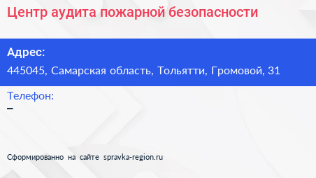 Центр аудита пожарной безопасности по адресу 445045, Самарская область, Тольятти, Громовой, 31 в дальнейшем Организация, размещена в следующих категориях: