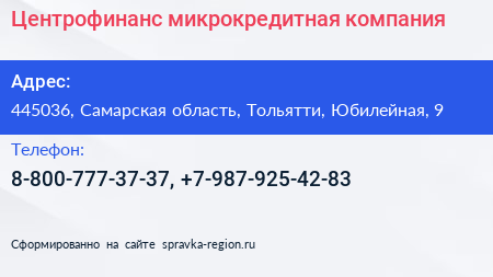 Центрофинанс, микрокредитная компания по адресу 445036, Самарская область, Тольятти, Юбилейная, 9 в дальнейшем Организация, размещена в следующих категориях: