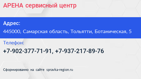 АРЕНА, сервисный центр по адресу 445000, Самарская область, Тольятти, Ботаническая, 5 в дальнейшем Организация, размещена в следующих категориях: