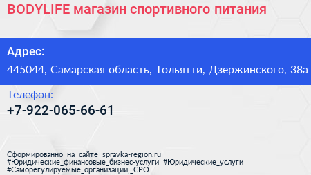 BODYLIFE, магазин спортивного питания по адресу 445044, Самарская область, Тольятти, Дзержинского, 38а в дальнейшем Организация, размещена в следующих категориях: