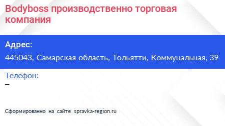 Bodyboss, производственно-торговая компания по адресу 445043, Самарская область, Тольятти, Коммунальная, 39 в дальнейшем Организация, размещена в следующих категориях: