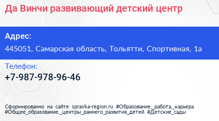 Да Винчи, развивающий детский центр по адресу 445051, Самарская область, Тольятти, Спортивная, 1а в дальнейшем Организация, размещена в следующих категориях:
