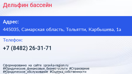 Дельфин, бассейн по адресу 445035, Самарская область, Тольятти, Карбышева, 1а в дальнейшем Организация, размещена в следующих категориях: