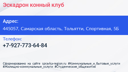 Эскадрон, конный клуб по адресу 445057, Самарская область, Тольятти, Спортивная, 5Б в дальнейшем Организация, размещена в следующих категориях: