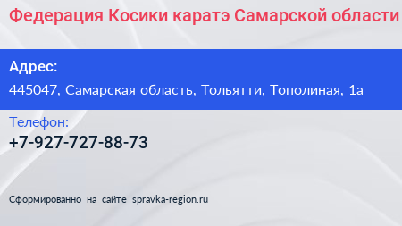 Федерация Косики каратэ Самарской области по адресу 445047, Самарская область, Тольятти, Тополиная, 1а в дальнейшем Организация, размещена в следующих категориях: