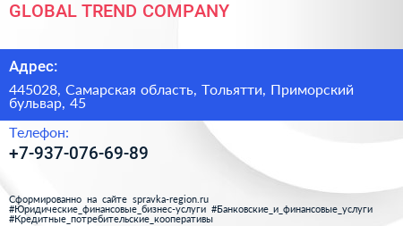 GLOBAL TREND COMPANY по адресу 445028, Самарская область, Тольятти, Приморский бульвар, 45 в дальнейшем Организация, размещена в следующих категориях: