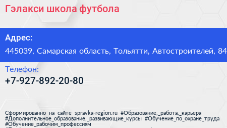 Гэлакси, школа футбола по адресу 445039, Самарская область, Тольятти, Автостроителей, 84 в дальнейшем Организация, размещена в следующих категориях: