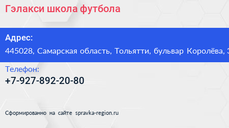 Гэлакси, школа футбола по адресу 445028, Самарская область, Тольятти, бульвар Королёва, 3 в дальнейшем Организация, размещена в следующих категориях: