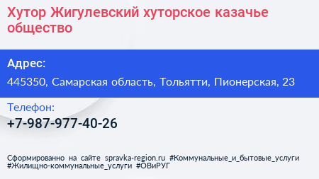 Хутор Жигулевский, хуторское казачье общество по адресу 445350, Самарская область, Тольятти, Пионерская, 23 в дальнейшем Организация, размещена в следующих категориях: