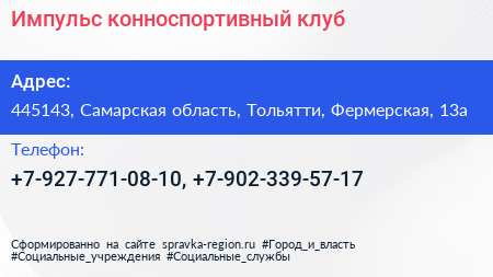 Импульс, конноспортивный клуб по адресу 445143, Самарская область, Тольятти, Фермерская, 13а в дальнейшем Организация, размещена в следующих категориях:
