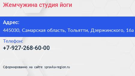 Жемчужина, студия йоги по адресу 445030, Самарская область, Тольятти, Дзержинского, 16а в дальнейшем Организация, размещена в следующих категориях: