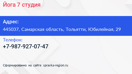 Йога-7, студия по адресу 445037, Самарская область, Тольятти, Юбилейная, 29 в дальнейшем Организация, размещена в следующих категориях: