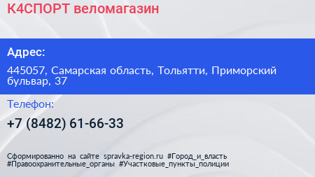 К4СПОРТ, веломагазин по адресу 445057, Самарская область, Тольятти, Приморский бульвар, 37 в дальнейшем Организация, размещена в следующих категориях: