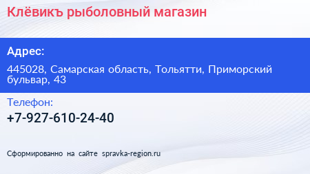 Клёвикъ, рыболовный магазин по адресу 445028, Самарская область, Тольятти, Приморский бульвар, 43 в дальнейшем Организация, размещена в следующих категориях: