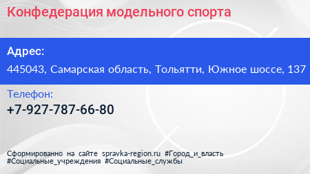 Конфедерация модельного спорта по адресу 445043, Самарская область, Тольятти, Южное шоссе, 137 в дальнейшем Организация, размещена в следующих категориях: