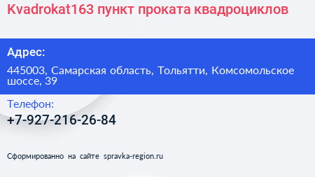 Kvadrokat163, пункт проката квадроциклов по адресу 445003, Самарская область, Тольятти, Комсомольское шоссе, 39 в дальнейшем Организация, размещена в следующих категориях: