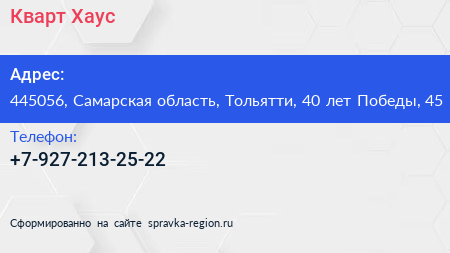Кварт Хаус по адресу 445056, Самарская область, Тольятти, 40 лет Победы, 45 в дальнейшем Организация, размещена в следующих категориях: