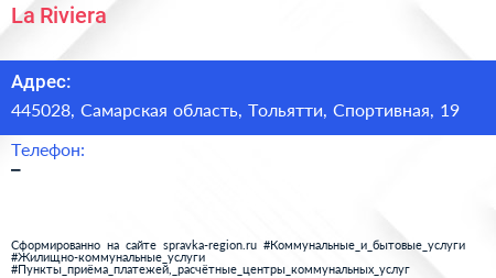La Riviera по адресу 445028, Самарская область, Тольятти, Спортивная, 19 в дальнейшем Организация, размещена в следующих категориях: