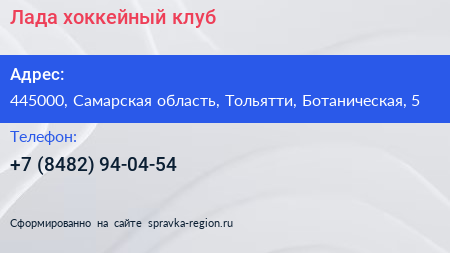 Лада, хоккейный клуб по адресу 445000, Самарская область, Тольятти, Ботаническая, 5 в дальнейшем Организация, размещена в следующих категориях:
