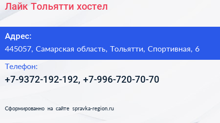 Лайк Тольятти, хостел по адресу 445057, Самарская область, Тольятти, Спортивная, 6 в дальнейшем Организация, размещена в следующих категориях: