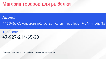 Магазин товаров для рыбалки по адресу 445045, Самарская область, Тольятти, Лизы Чайкиной, 85 в дальнейшем Организация, размещена в следующих категориях: