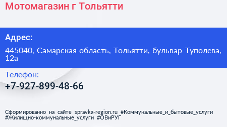 Мотомагазин, г. Тольятти по адресу 445040, Самарская область, Тольятти, бульвар Туполева, 12а в дальнейшем Организация, размещена в следующих категориях: