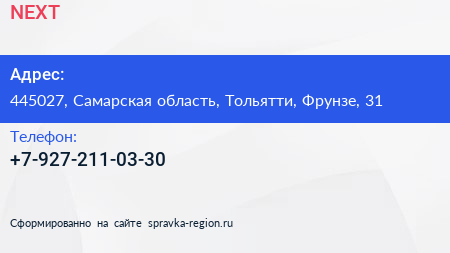 NEXT по адресу 445027, Самарская область, Тольятти, Фрунзе, 31 в дальнейшем Организация, размещена в следующих категориях: