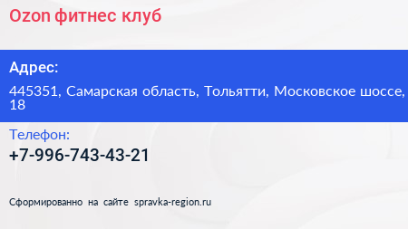 Ozon, фитнес-клуб по адресу 445351, Самарская область, Тольятти, Московское шоссе, 18 в дальнейшем Организация, размещена в следующих категориях: