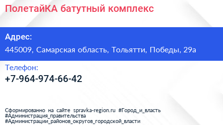 ПолетайКА, батутный комплекс по адресу 445009, Самарская область, Тольятти, Победы, 29а в дальнейшем Организация, размещена в следующих категориях: