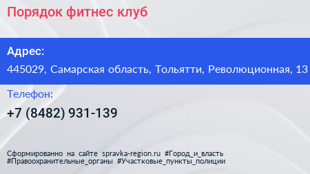Порядок, фитнес-клуб по адресу 445029, Самарская область, Тольятти, Революционная, 13 в дальнейшем Организация, размещена в следующих категориях: