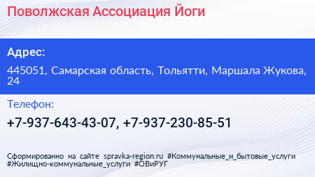 Поволжская Ассоциация Йоги по адресу 445051, Самарская область, Тольятти, Маршала Жукова, 24 в дальнейшем Организация, размещена в следующих категориях: