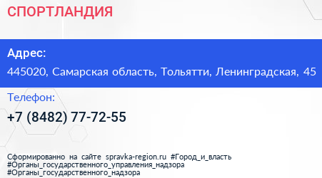 СПОРТЛАНДИЯ по адресу 445020, Самарская область, Тольятти, Ленинградская, 45 в дальнейшем Организация, размещена в следующих категориях: