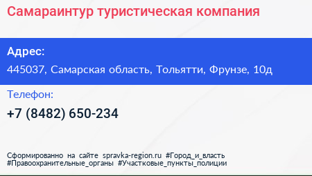 Самараинтур, туристическая компания по адресу 445037, Самарская область, Тольятти, Фрунзе, 10д в дальнейшем Организация, размещена в следующих категориях: