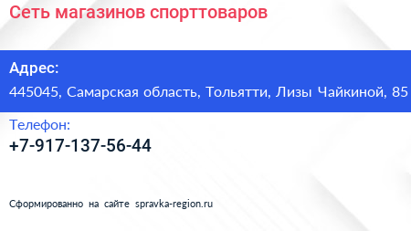 Сеть магазинов спорттоваров по адресу 445045, Самарская область, Тольятти, Лизы Чайкиной, 85 в дальнейшем Организация, размещена в следующих категориях: