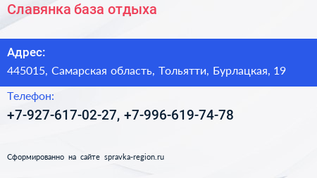 Славянка, база отдыха по адресу 445015, Самарская область, Тольятти, Бурлацкая, 19 в дальнейшем Организация, размещена в следующих категориях: