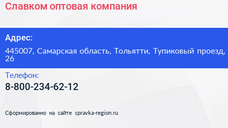 Славком, оптовая компания по адресу 445007, Самарская область, Тольятти, Тупиковый проезд, 26 в дальнейшем Организация, размещена в следующих категориях: