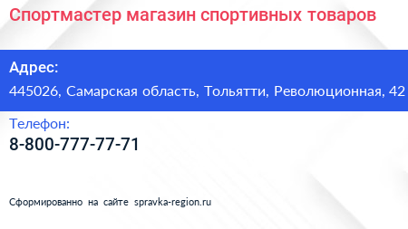 Спортмастер, магазин спортивных товаров по адресу 445026, Самарская область, Тольятти, Революционная, 42 в дальнейшем Организация, размещена в следующих категориях: