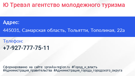 Ю-Тревэл, агентство молодежного туризма по адресу 445031, Самарская область, Тольятти, Тополиная, 22а в дальнейшем Организация, размещена в следующих категориях: