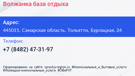 Волжанка, база отдыха по адресу 445015, Самарская область, Тольятти, Бурлацкая, 24 в дальнейшем Организация, размещена в следующих категориях: