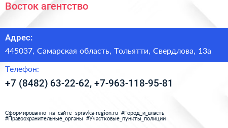 Восток, агентство по адресу 445037, Самарская область, Тольятти, Свердлова, 13а в дальнейшем Организация, размещена в следующих категориях: