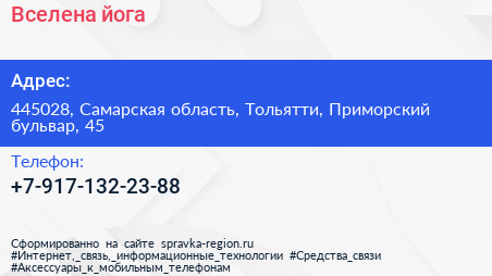 Вселена йога по адресу 445028, Самарская область, Тольятти, Приморский бульвар, 45 в дальнейшем Организация, размещена в следующих категориях: