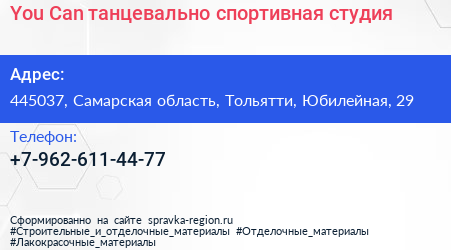 You Can!, танцевально-спортивная студия по адресу 445037, Самарская область, Тольятти, Юбилейная, 29 в дальнейшем Организация, размещена в следующих категориях: