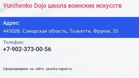 Yurchenko Dojo, школа воинских искусств по адресу 445028, Самарская область, Тольятти, Фрунзе, 35 в дальнейшем Организация, размещена в следующих категориях: